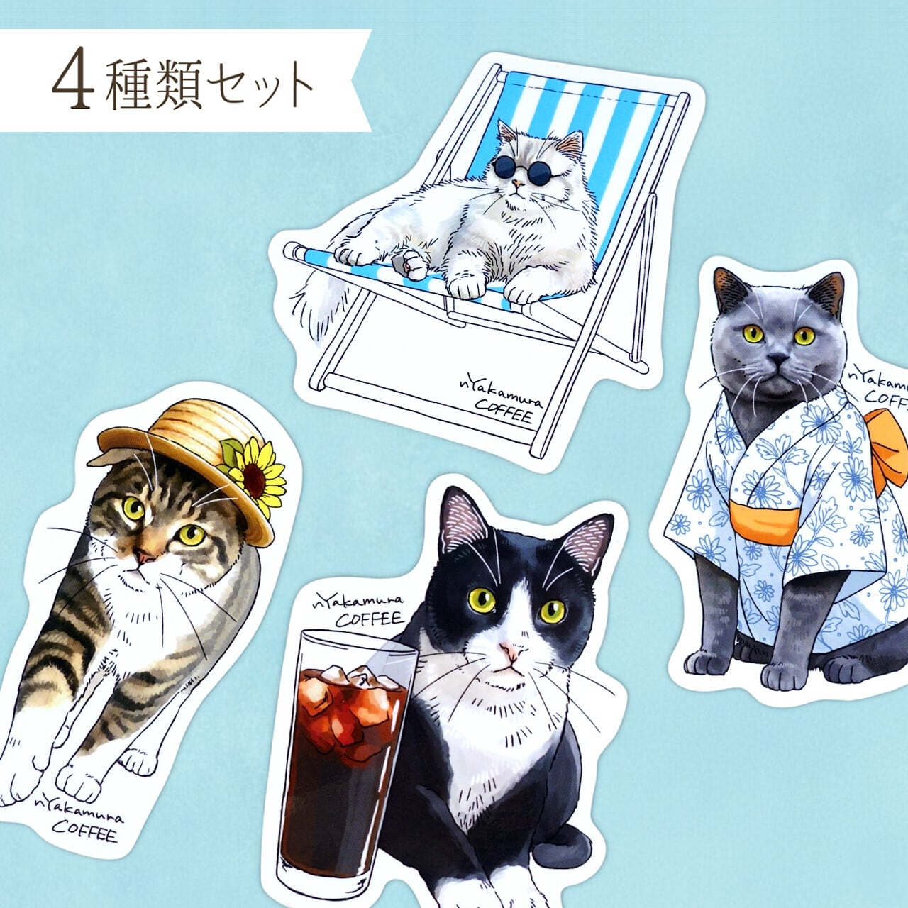 夏をイメージした猫ちゃんのステッカー4枚セット。(大きさは画像参照)