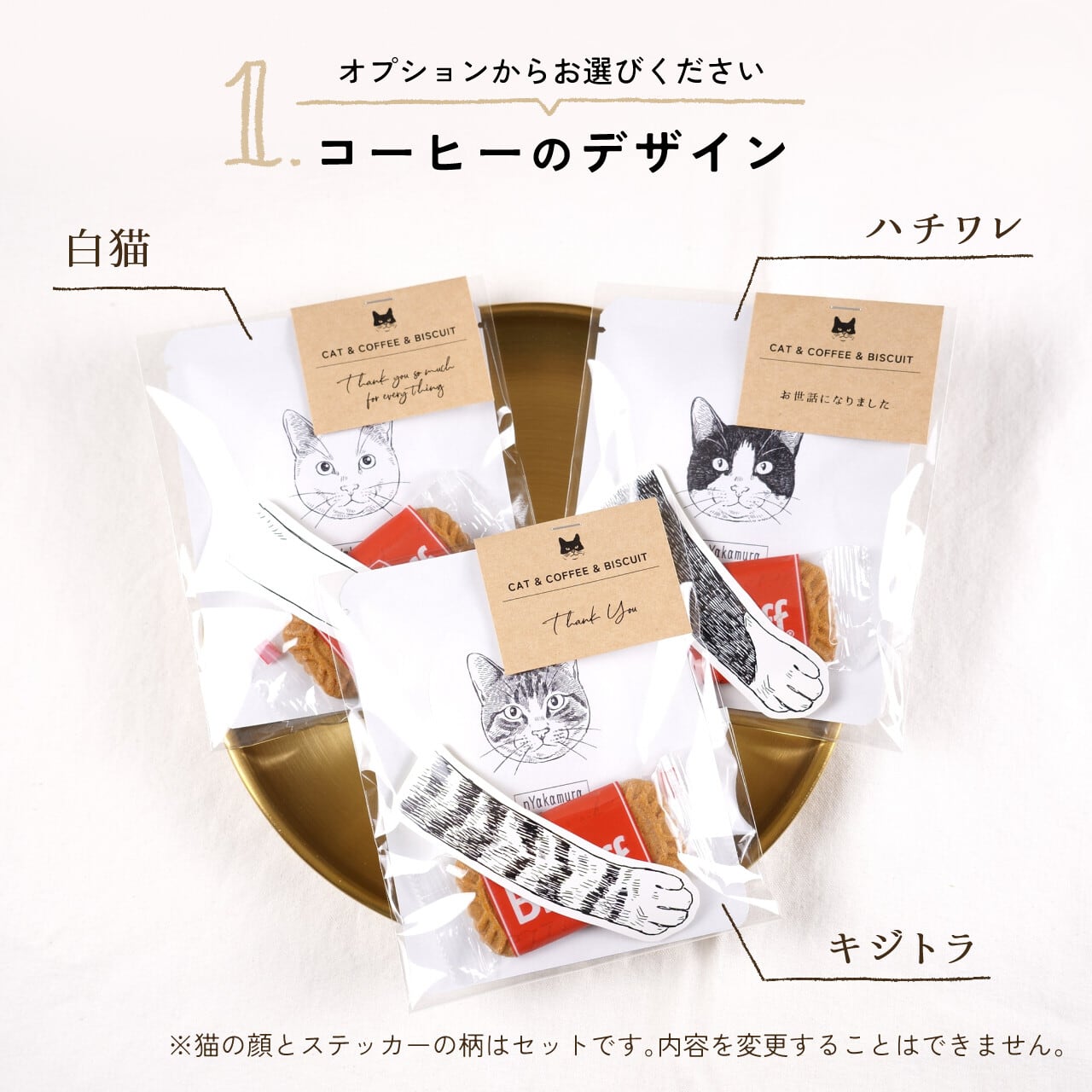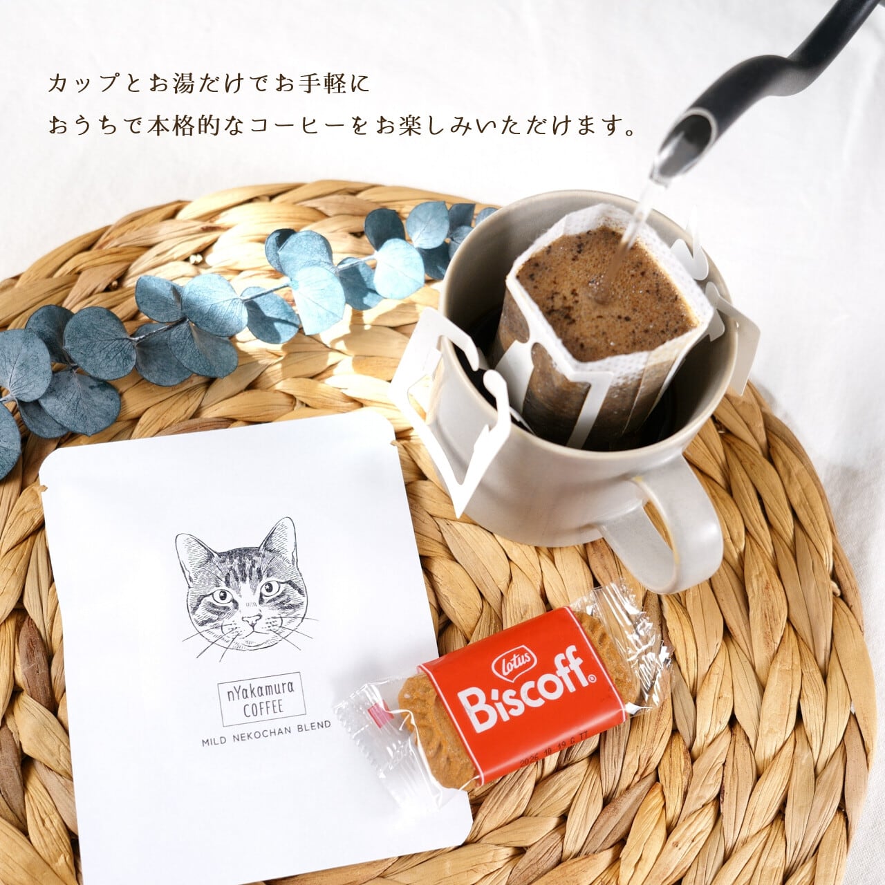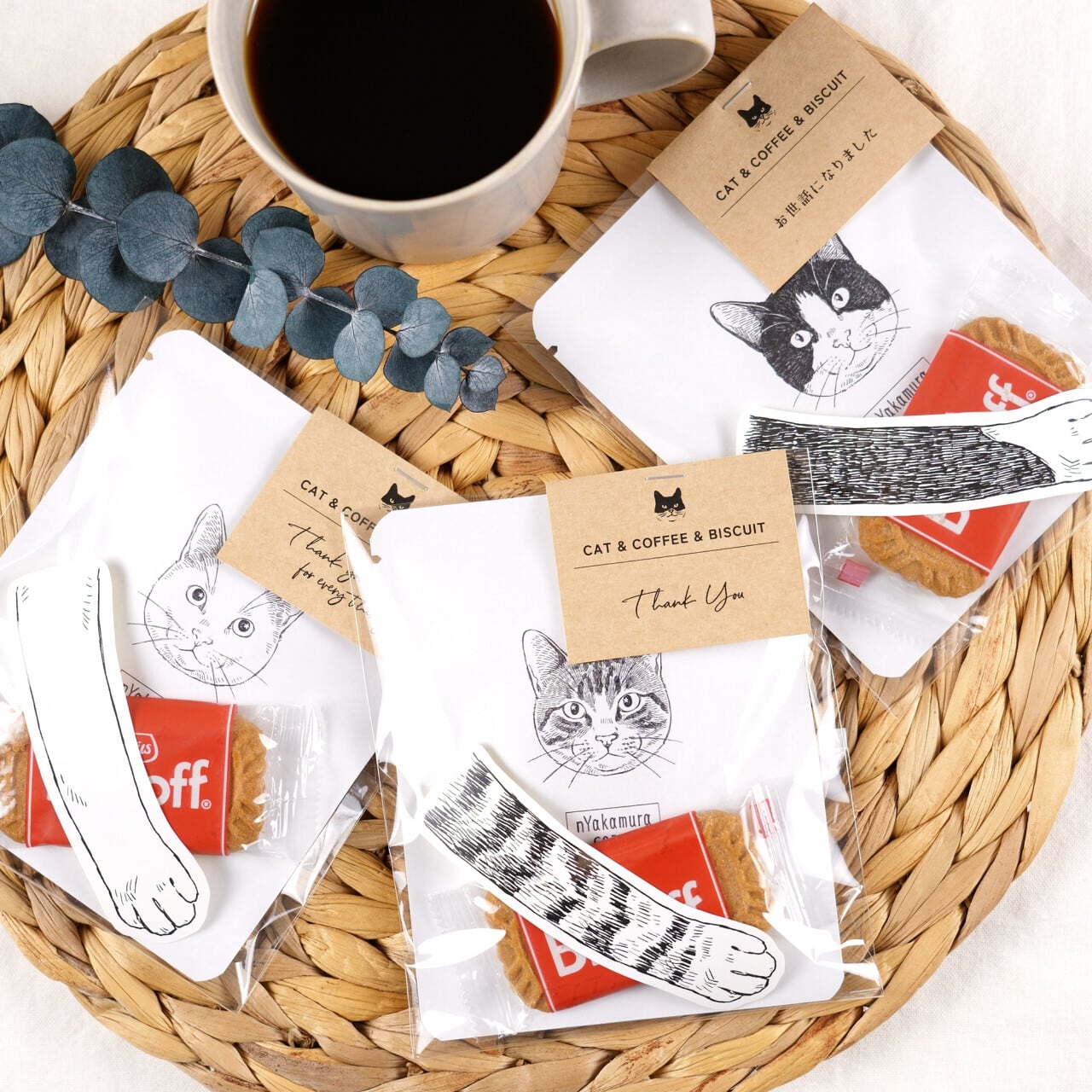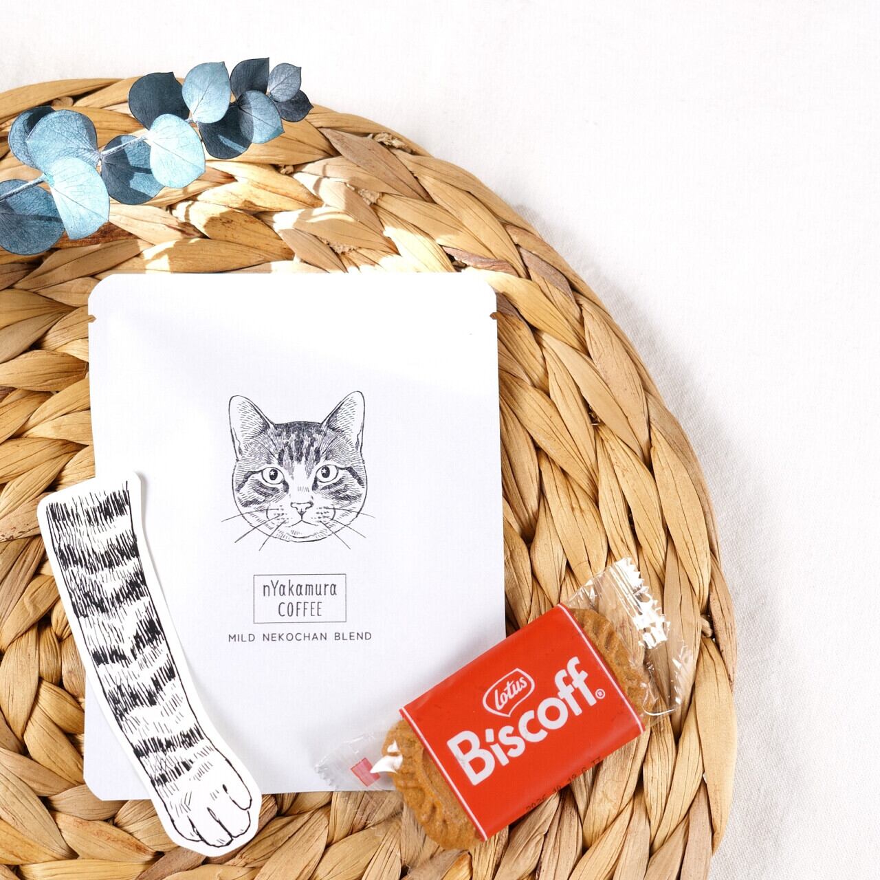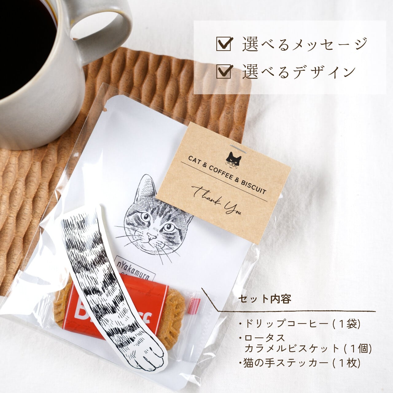 当店オリジナルブレンドコーヒー【マイルドネコチャンブレンド】のドリップバッグ1袋、ロータスカラメルビスケット1個、猫の手ステッカー1枚がセットになったプチギフト。